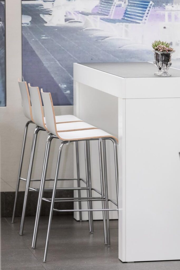 Der Barhocker LEO ist ein echter Klassiker und vielseitig einsetzbar. Die weiße Sitzschale aus Holz sorgt für eine klare, moderne Optik, während das Chromgestell einen eleganten Akzent setzt.