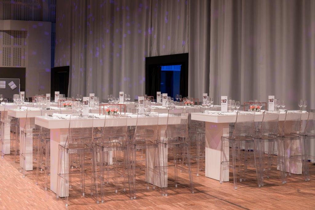Der weiße Hochtisch überzeugt mit modernem Design und robuster, pflegeleichter Oberfläche. Mit Platz für bis zu 8 Personen eignet er sich ideal für jede Art von Events.