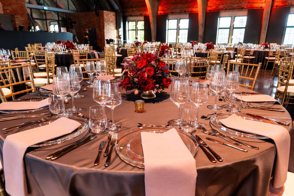 Wir hatten die Ehre, das WECC in Berlin mit eleganten Tischen, edlen Chiavari Stühlen in gold und einer prächtigen Tischdekoration auszustatten.