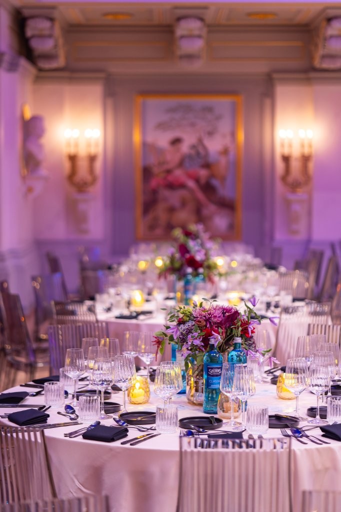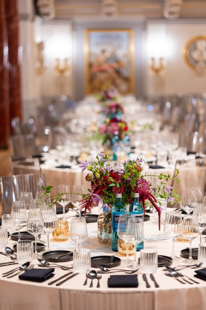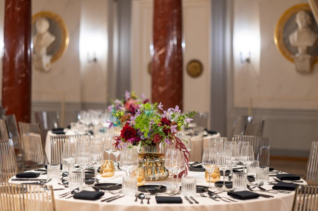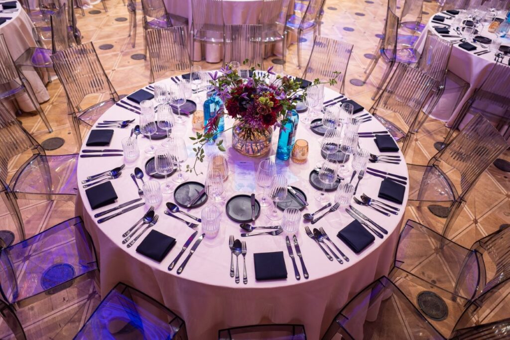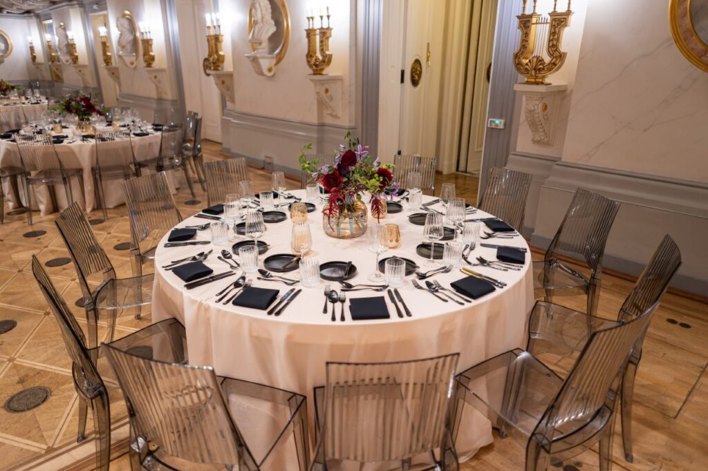 Zum Einsatz kam unser Acrylstuhl Glenda, kombiniert mit schlichten Tischdecken in hellem Champagner und schwarzen Servietten als gezieltem Kontrast. Ein stimmiges Setting, das den besonderen Charakter der Location unterstrich und den Abend in einem einzigartigen Rahmen erlebbar machte.
